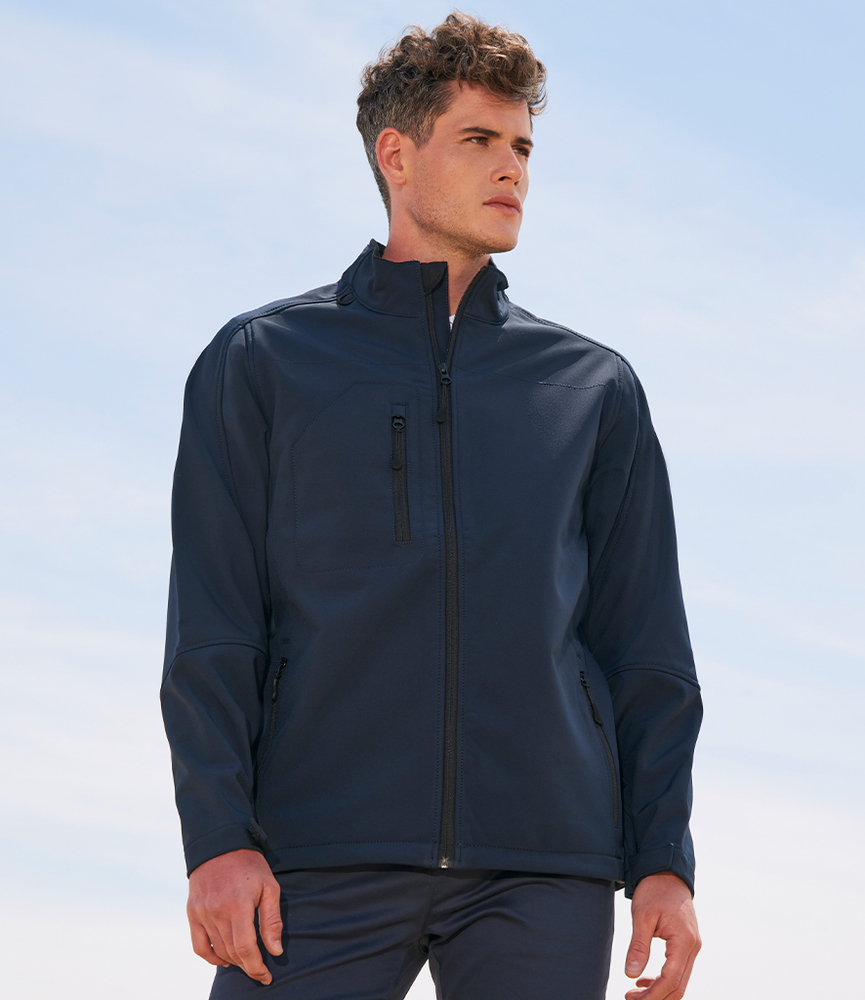 Three layer soft shell. 94% polyester/6% elastane outer. Polyester fleece backed. Mesh lined front panels. Showerproof, windproof and breathable. Taped neck. Collar high full length zip with chin guard and inner zip guard. Right chest zip pocket. Two front zip pockets. Tear release adjustable cuffs. Drawcord hem. Drop hem. Access for decoration.