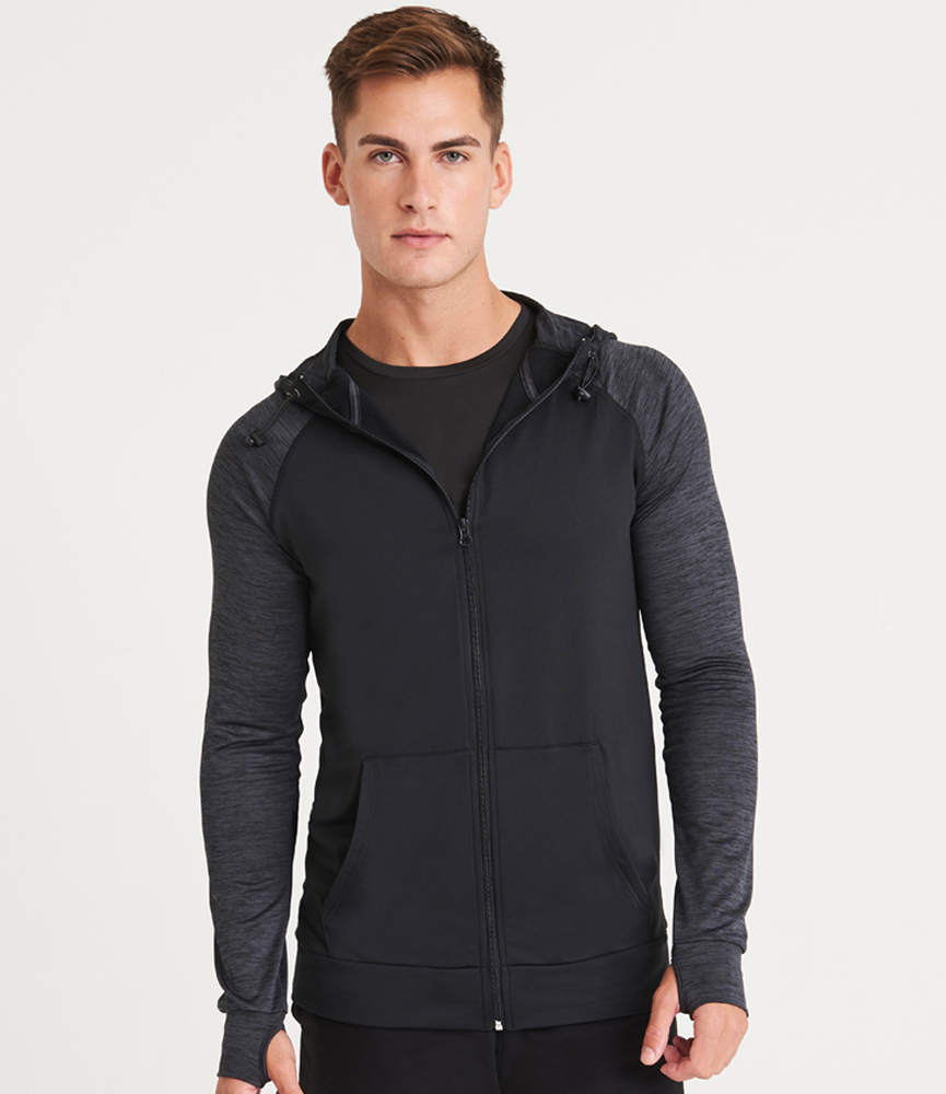 Body 89% polyester/11% elastane. Hood and sleeves 92% polyester/8% elastane. DynamicCool™ responsive blended fabric. Contrast melange effect grown on adjustable hood and raglan sleeves. Taped neck. Full length zip. Front pouch pockets. Thumbholes on cuffs. Tear out label.