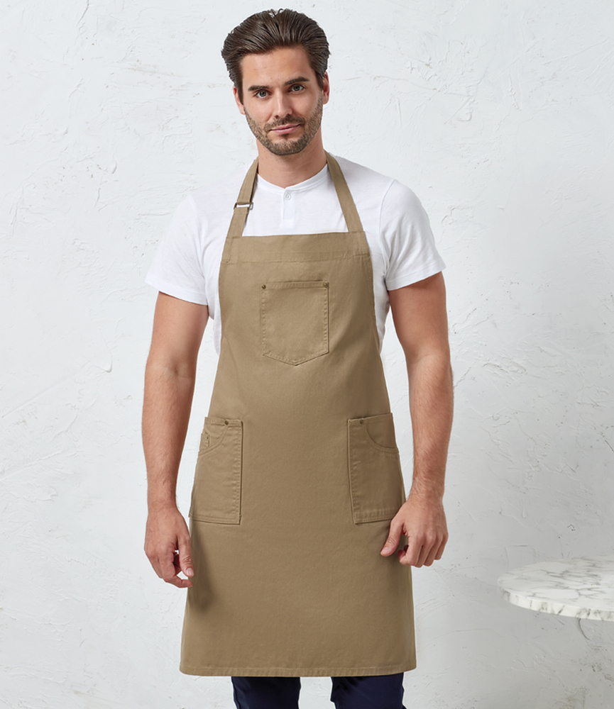 100% cotton twill. Self fabric neckband with buckle and adjustable stud closure. Three chino style stitched pockets with rivets. Width 72cm. Length 86cm. Industrial laundry 85°C. Domestic wash 60°C.