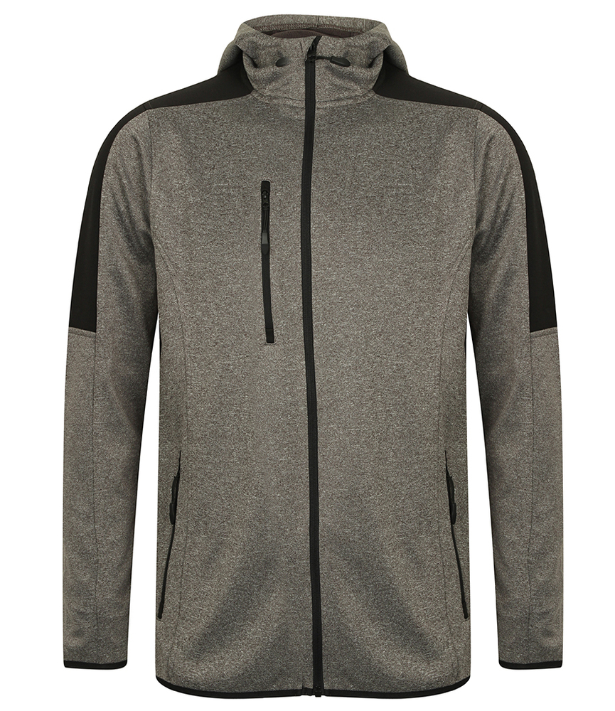Two layer soft shell. 100% polyester.Soft jersey fabric with bonded micro fleece reverse.Three panel hood.Contrast shoulders and upper sleeve panels.Full length contrast zip with non-slip gripper zip pulls.Contrast right chest and two front zip pockets.Top stitched side panels.Stretch bound cuffs and hem.Drop hem.