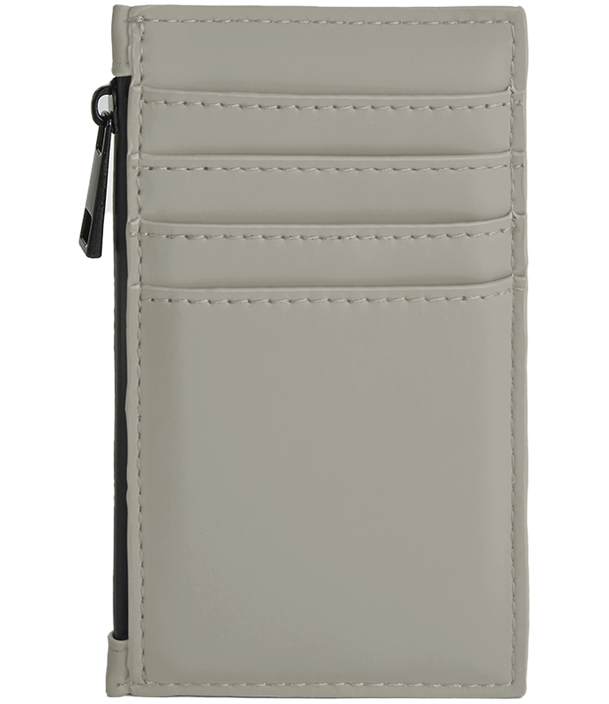 100% recycled polyester with matte-look PU coating. Minimalist styling. Rubberised zips. Holds four credit cards. Can be decorated front and rear. Tear out label.