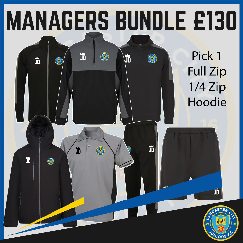 Our managers bundle come with the following items and the price includes printed club badge and your initials. please leave your intials in the box provided also we recommend getting a size down is shorts from the pants size these seem to fit better. just order your normal size for clothing as these are true to size.