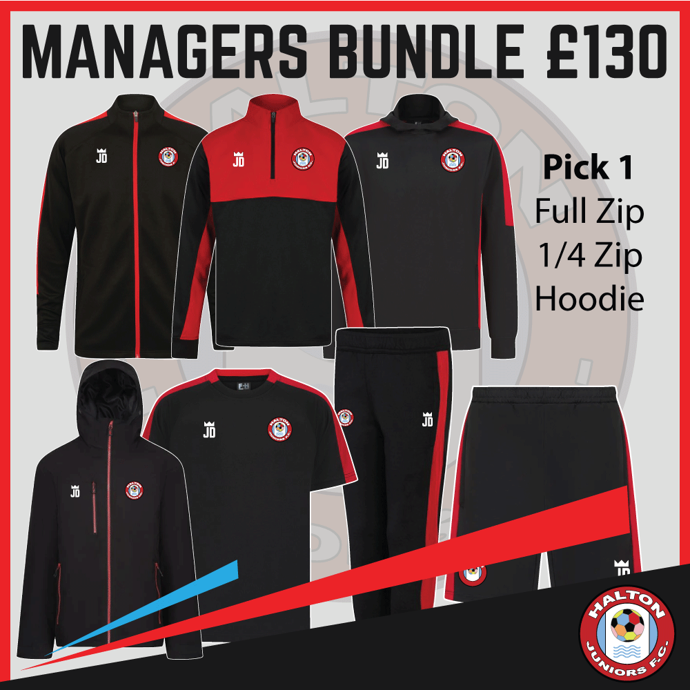 Our managers bundle come with the following items and the price includes printed club badge and your initials. please leave your intials in the box provided also we recommend getting a size down is shorts from the pants size these seem to fit better. just order your normal size for clothing as these are true to size.